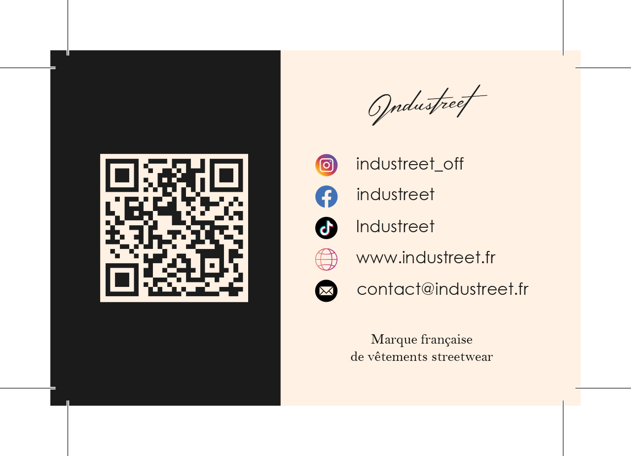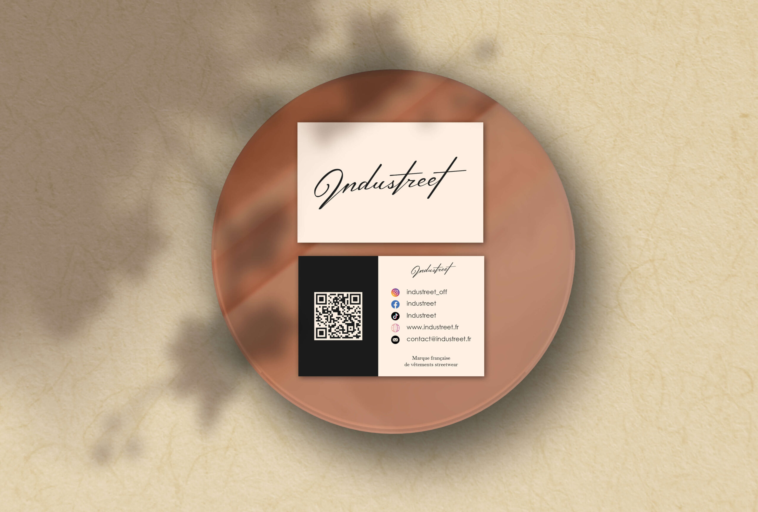 La carte de visite, minimaliste et percutante, prolonge cet univers visuel en intégrant un QR code et des pictogrammes sociaux, pour une communication directe et efficace, fidèle à l’esthétique épurée d’Industreet.